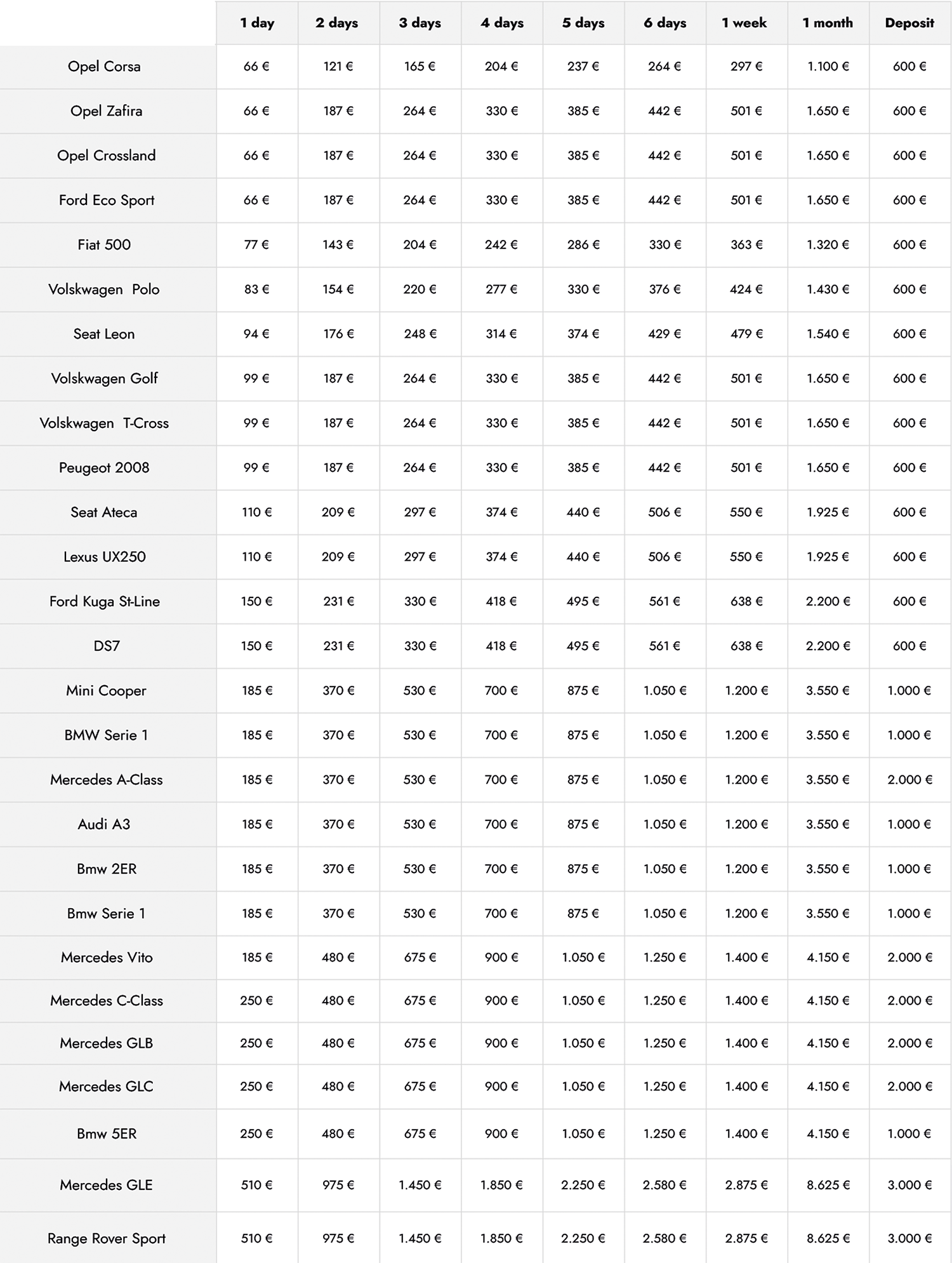 Prices of our cars per day at La Alcaidesa Rent A Car